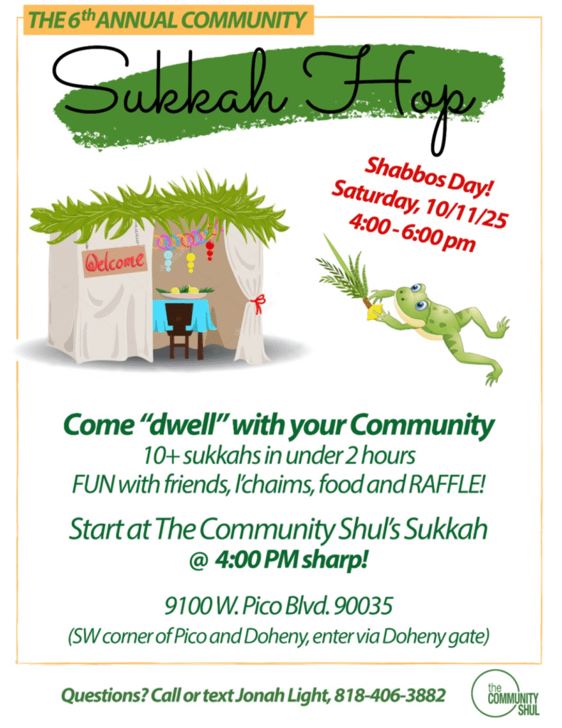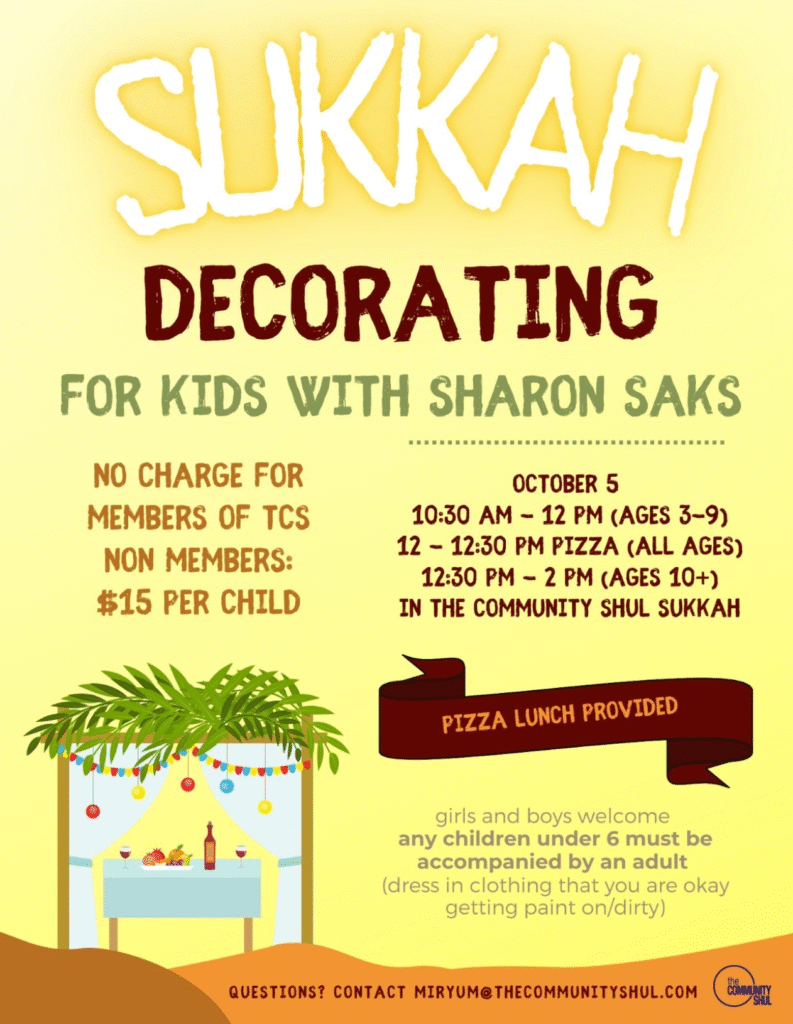 Become a Member Bulletin Ask the Rabbi UPCOMING EVENTS Sukkah Decorating Sukkah Hop BBQ Lunch Journey to Virtue Timeless Wisdom WEEKLY SHIURIM Monday-Friday7:00 am: No Gemera this sunday Between mincha/maariv – Daily Kitzur – Laws of Sukkos – Rabbi Cohen Thursdays12:00 pm Pirkei Avos (Zoom ID 4288024739) – Howard Witkin DAVENING SCHEDULE Sukkos Schedule Subscribe to our newsletter Email Subscribe