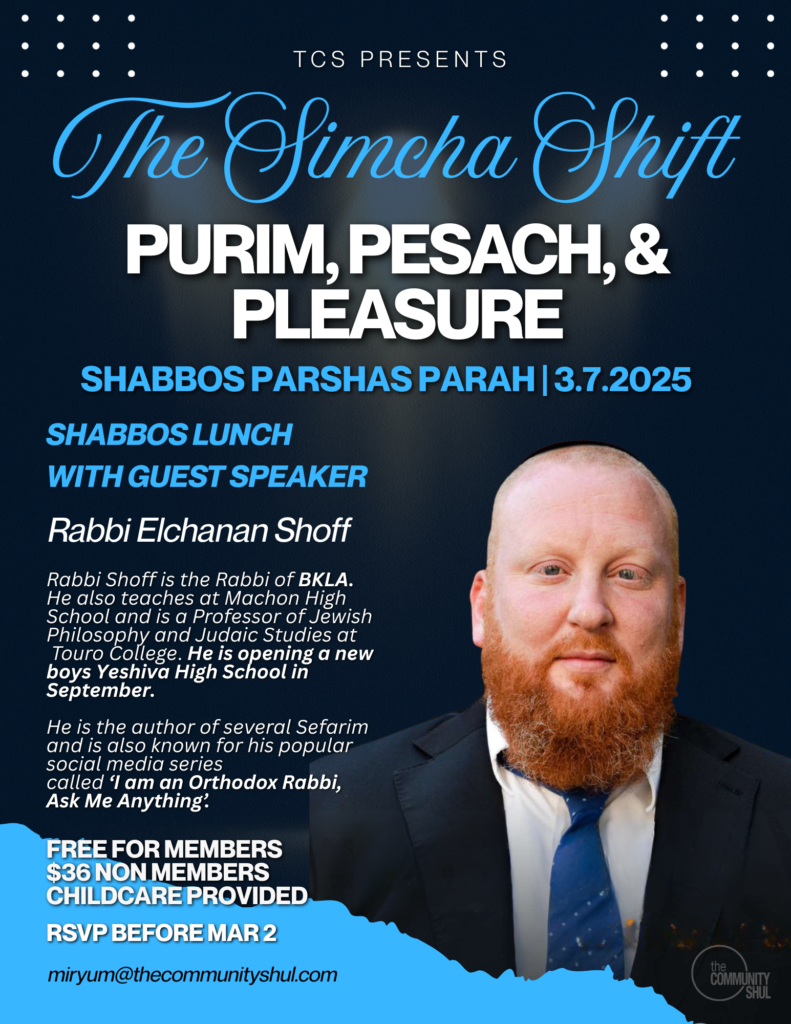 Become a Member Bulletin Ask the Rabbi UPCOMING EVENTS The Shabbat Experience Exodus: The OG Jewish Philosophy 101 Timeless Wisdom WEEKLY SHIURIM Monday-Friday7:00 am: Sanhedrin 90b – Techias Hamesim – Rabbi Cohen8:30 am – Daily Kitzur – Mashiv Haruach – Rabbi Cohen Thursdays12:00 pm Pirkei Avos (Zoom ID 4288024739) – Howard Witkin DAVENING SCHEDULE Subscribe to our newsletter Email Subscribe